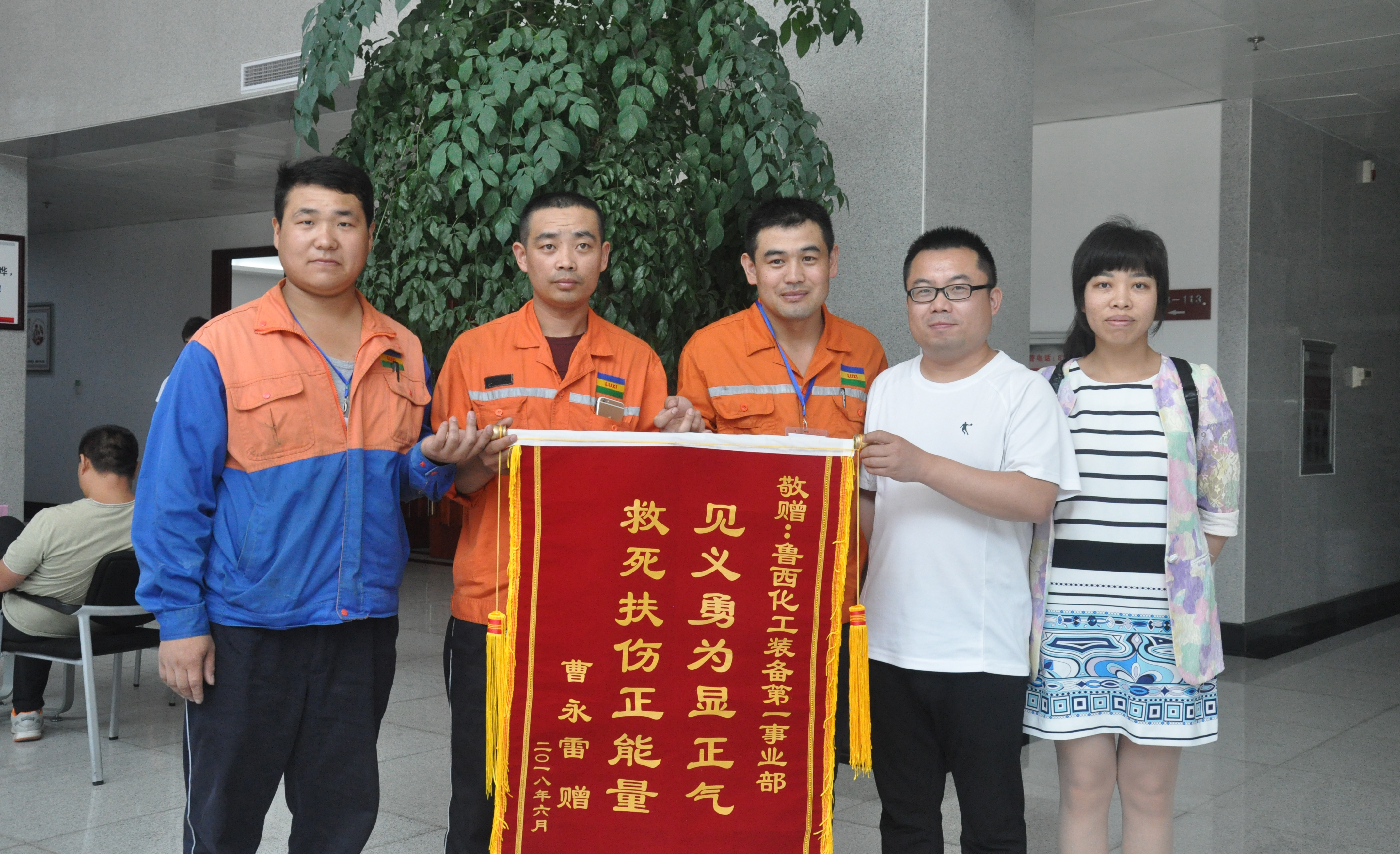 ? ? ? 6月15日上午10點,家住東阿的曹永雷先生在妻子及東阿縣人社局領導的陪同下,將一面寫有“見義勇為顯正氣 ?救死扶傷正能量”的錦旗送至魯西集團,要感謝前段時間自己在遭遇車禍生命垂危時出手相助的第一工程事業(yè)部員工張修振、劉召浩、齊玉祥三位好心人。“如果當時沒有魯西集團三位員工的熱心相助,真不知道會有多么嚴重的后果!真是太感謝你們了!”曹先生激動地說。