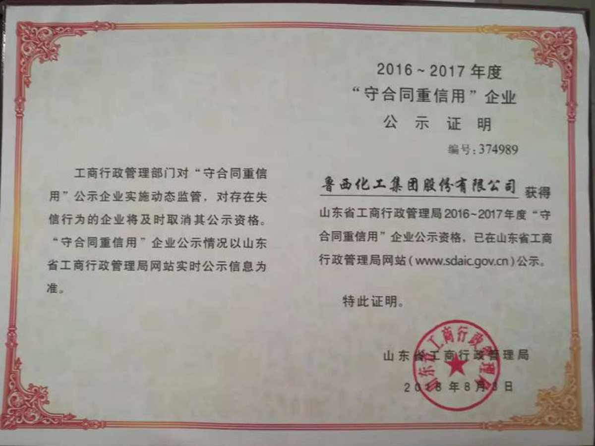 ? ? ? 10月9日,魯西化工集團股份有限公司收到了山東省工商行政管理局頒發的“2016-2017年度守合同重信用”的表彰證書。