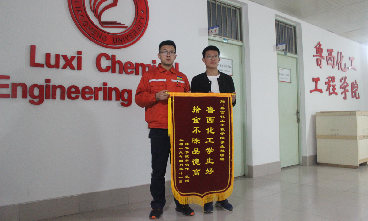 ? ? ? 近日,聊城大學政管學院李欽偉同學來到魯西化工工程學院管理辦公室,送來一面“魯西化工學生好 拾金不昧品德高”的錦旗。