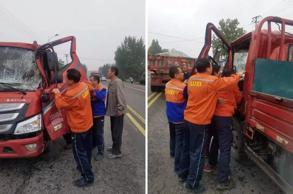 10月10日8時(shí)40分,在距黃河大橋500米處發(fā)生交通事故:一輛臨沂牌照的小貨車與聊城半掛追尾,貨車司機(jī)被困駕駛室內(nèi),司機(jī)的女兒圍著駕駛室直跺腳,當(dāng)時(shí)的情況萬(wàn)分緊急。魯西集團(tuán)平陰魯西裝備公司的龐汝金、王甲勝、侯斌、趙昊忠和司機(jī)于波駕車去集團(tuán)送貨途經(jīng)車禍現(xiàn)場(chǎng),五名員工立即下車一邊救助傷員,一邊維護(hù)交通秩序,受到過路司機(jī)和交警的稱贊。