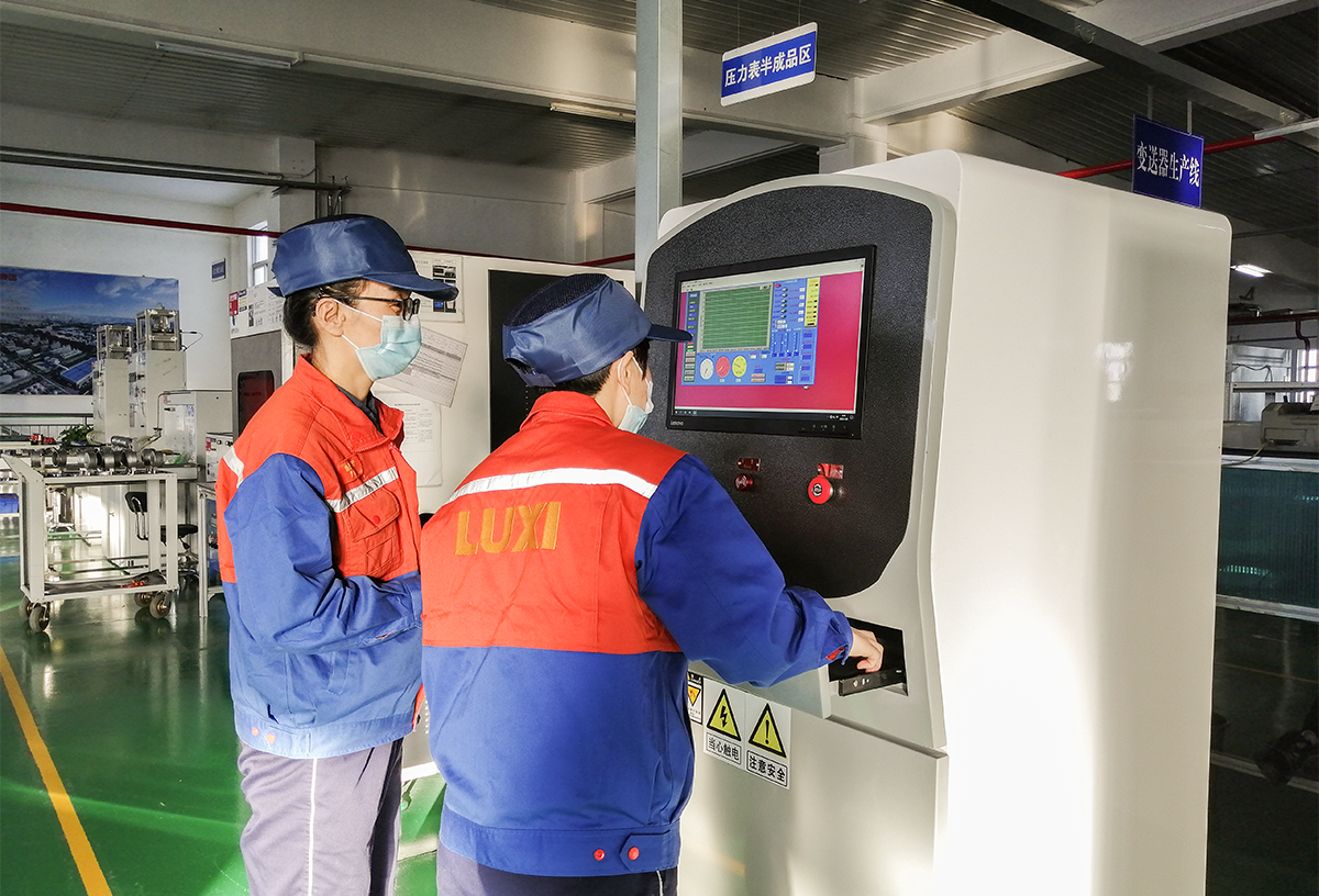 “壓力表抗疲勞測試,試驗壓力最高60Mpa,采用計算機控制,各種參數均可在計算機上設置完成,可以實時顯示壓力曲線,計算機控制升壓速率,配備兩臺液體增壓泵通過高低閥控制壓力輸出。一旦漏壓,電腦可自動報警,輕松實現輸出壓力任意可調、可控。一次性可對30臺壓力表進行抗疲勞測試,技術先進,結構設計合理,安全可靠。”壓力表制作小組長王師傅,正在對小組成員認真講解并示范壓力表疲勞試驗機的操作與使用。