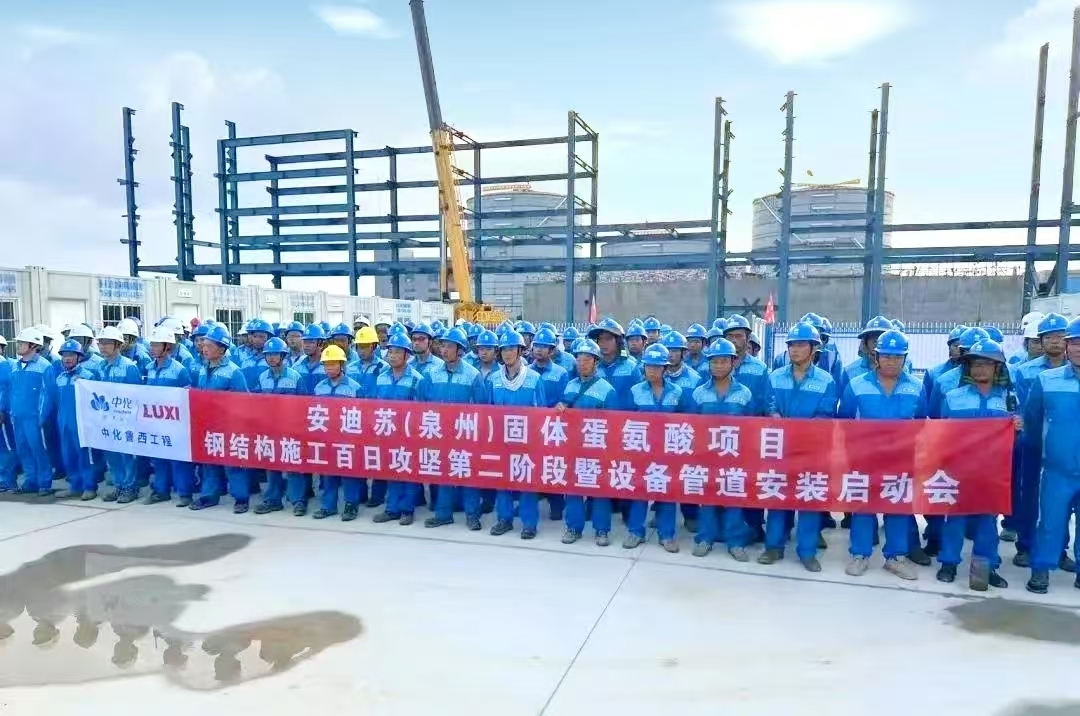 中化魯西工程承建的安迪蘇(泉州)蛋氨酸項目現場,隆重舉行"鋼結構安裝第二階段暨設備管道安裝啟動會"儀式。全體建設者將以時不我待的緊迫感、精益求精的專業態度和勇擔重任的使命感,凝心聚力,攻堅克難,堅決打贏鋼結構安裝收官戰,高效推進設備管道安裝新戰役,確保項目整體建設進度目標按期完成。